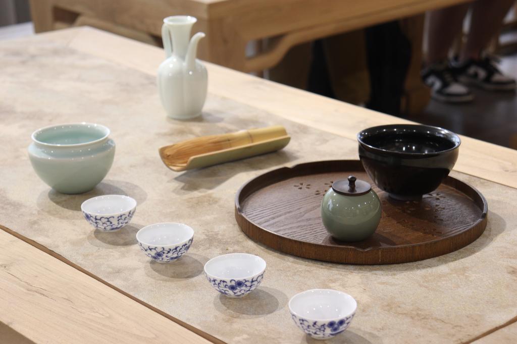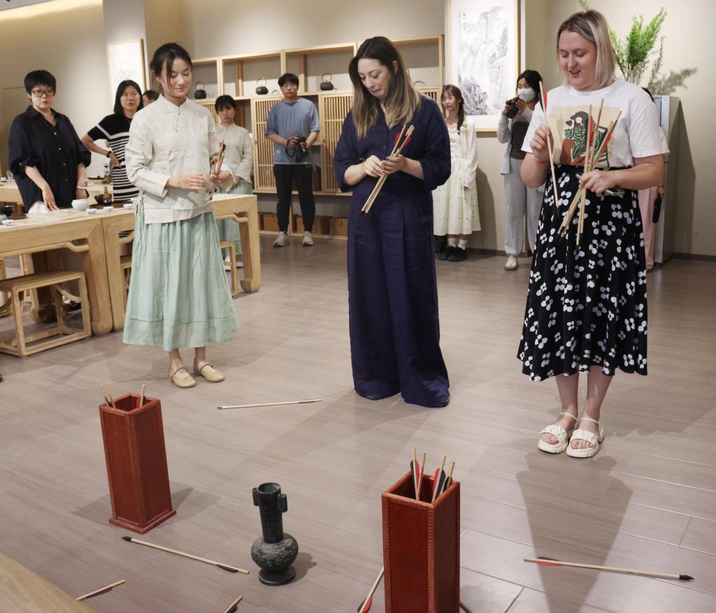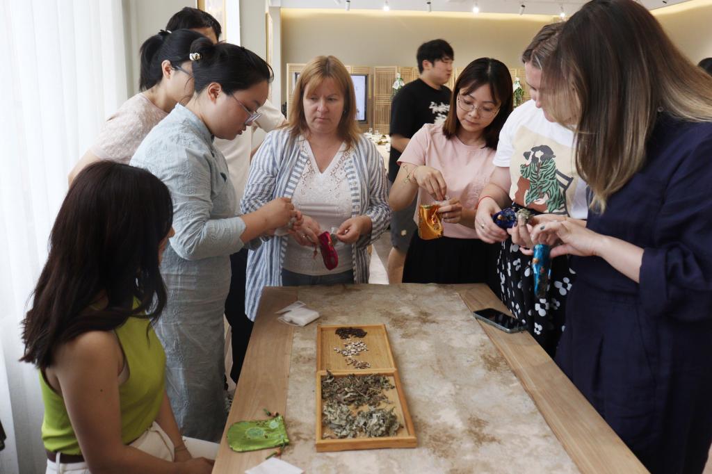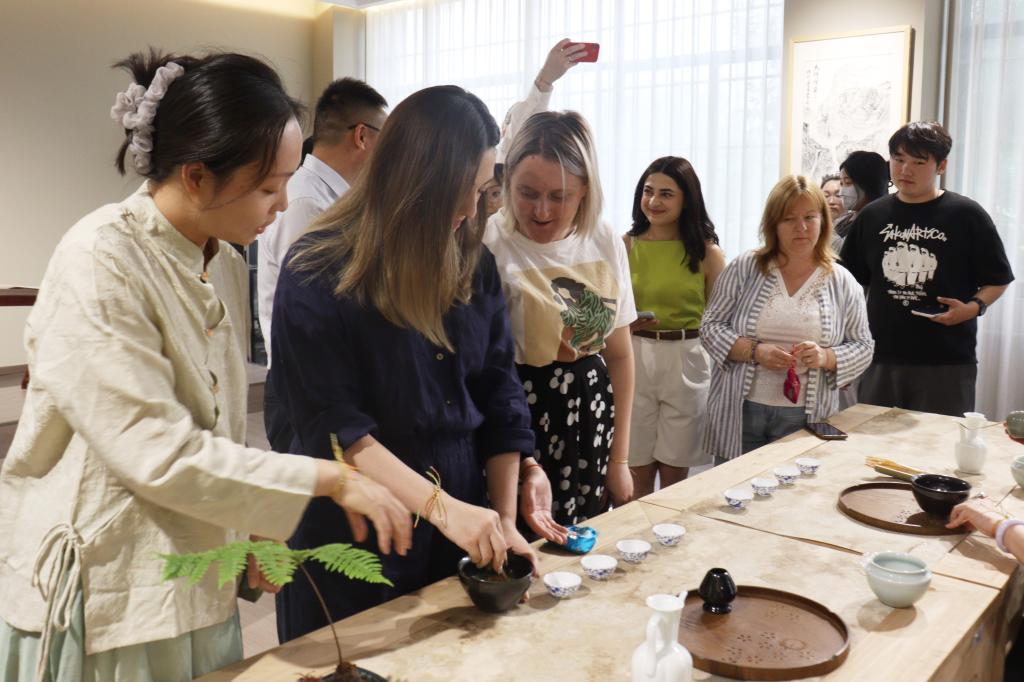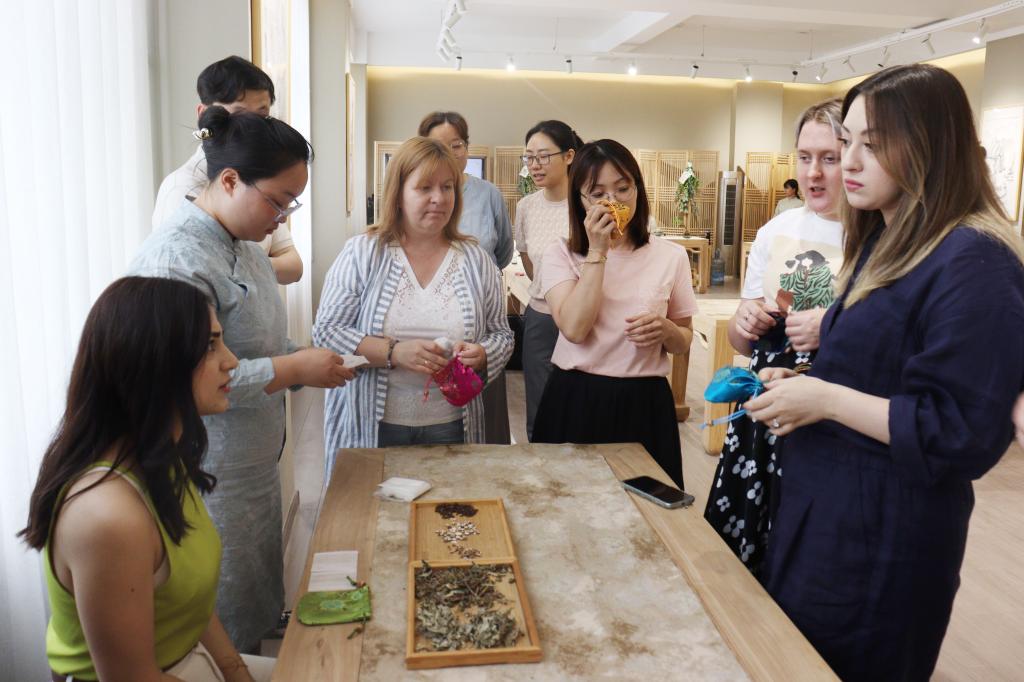 本次端午茶会包括净手签到、佩戴五彩绳和香囊、投壶、制作香囊、赏鉴干茶、品茶、吃粽子、宋式点茶体验等环节。茶品赏鉴和传统文化活动体验结合,使与会的嘉宾既能品鉴中国茶的独特韵味和多样口感,又能切身体验端午节日文化活动的丰富内涵,深入了解和体验了中华优秀传统文化。外籍教师们兴致盎然参与了茶会的每个环节。通过听讲解,了解端午习俗和茶品知识;通过观看冲泡展示,了解中国茶艺的意蕴;通过赏鉴茶汤,品味中国茶的独特口感和深厚韵味;通过品尝茶点和粽子,了解节日饮食的特点;通过香囊制作和投壶,体验节日活动的仪式感……2138CC太阳集团学生在引导服务的过程中,细心向老师们介绍每件物品的名称和作用、每种活动的文化寓意,加深了嘉宾们对中华文化的理解,展示了我校学生丰富的知识储备和优秀的专业技能。