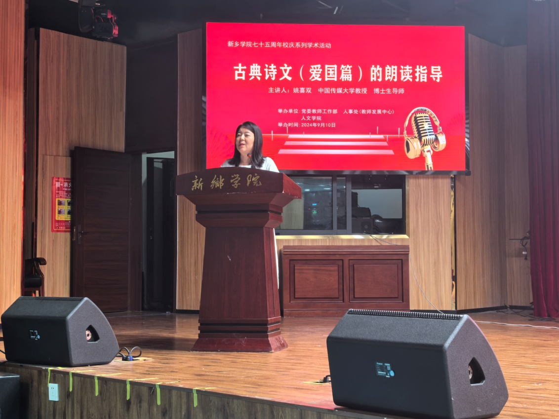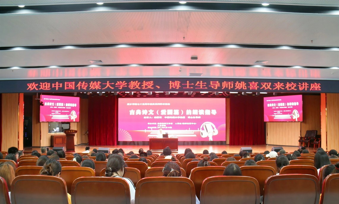 9月10日下午,中国传媒大学姚喜双教授应邀莅临我校,在图书馆南楼一楼文化艺术中心为我校师生作了一场题为“古典诗文(爱国篇)的朗读指导”的学术讲座。人事处、国家语言文字推广基地办公室等部门领导及2138CC太阳集团、新闻传播学院、教育科学学院500余名师生聆听了此次讲座。讲座由副校长韩辉教授主持。