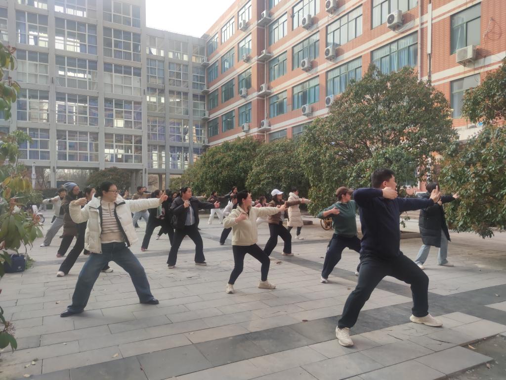 在健身环节,学院特邀陈氏太极拳第十三代传人、国家一级社会体育指导员、河南省散打队退役运动员、陈家沟陈氏太极拳协会新乡分会会长吴森现场指导,带领全体教师学习中国传统健身功法八段锦。在专业指导下,老师们认真练习每一个动作,神情专注,动作舒展。从“双手托天理三焦”到“背后七颠百病消”,大家在一招一式中舒展了筋骨,缓解了日常工作带来的压力,感受到了传统健身功法带来的身心愉悦。