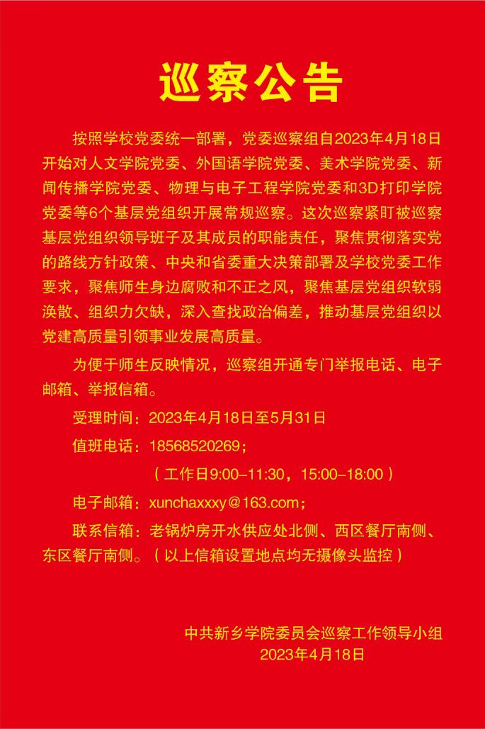 为便于师生反映情况,巡察组开通专门举报电话、电子邮箱、举报信箱。