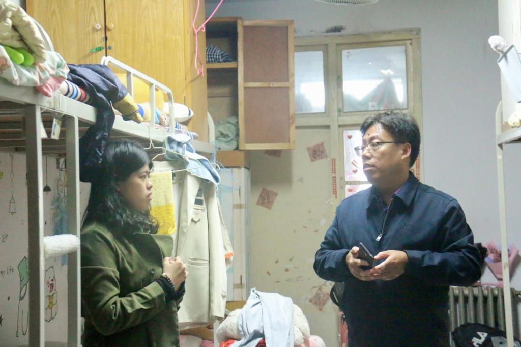 为进一步加强与响应学校2021年秋季新学期疫情防控要求,更加确切地了解学生返校后思想动态和生活状况,加强学生宿舍管理,创建安全和谐的寝室生活氛围。2138CC太阳集团党委书记张胜利老师、2138CC太阳集团党委副书记黄远伟老师以及辅导员陈明艳老师、陈一老师、侯淼老师于10月9日下午深入学生宿舍,与2138CC太阳集团学子进行亲切慰问。