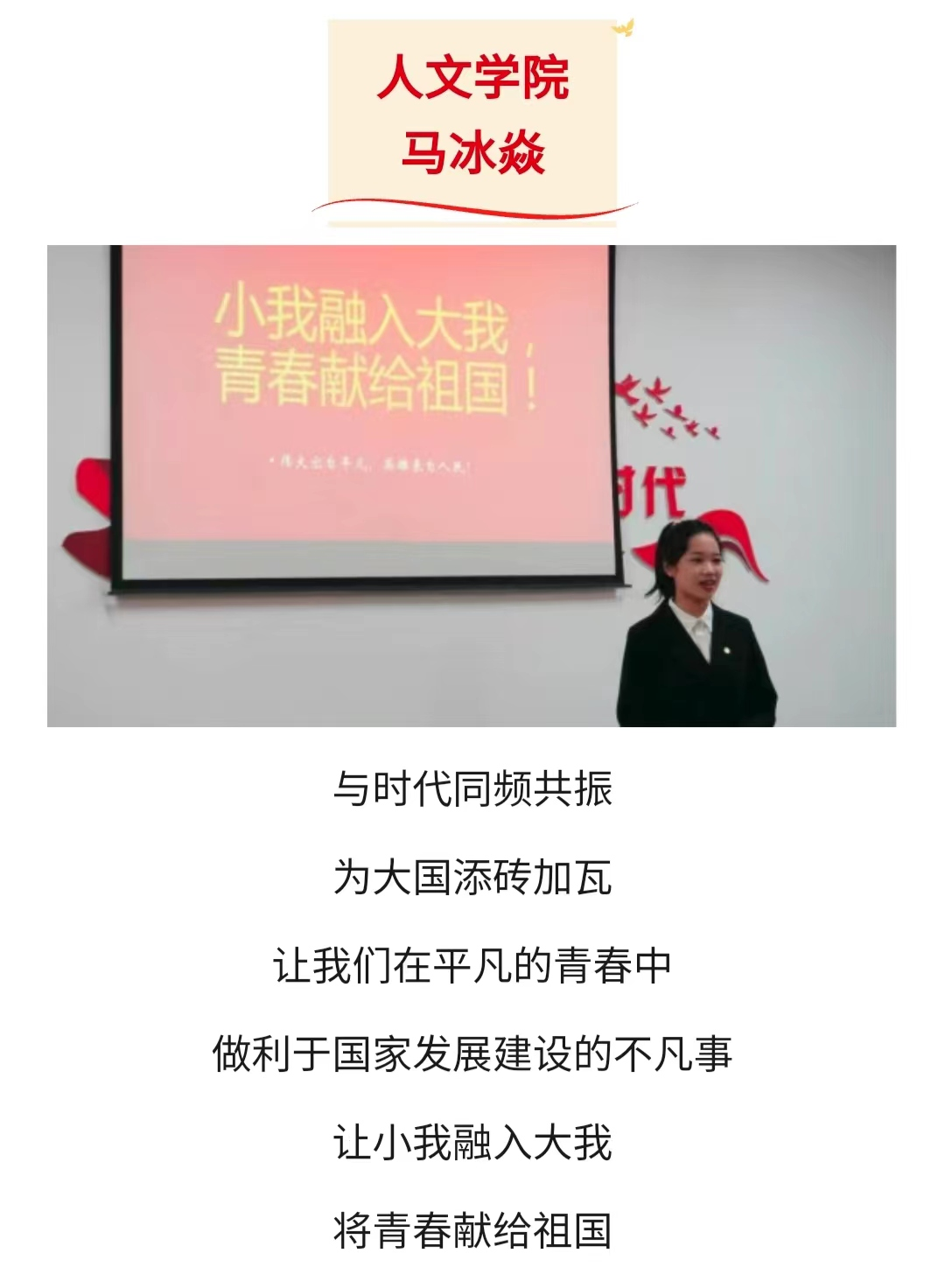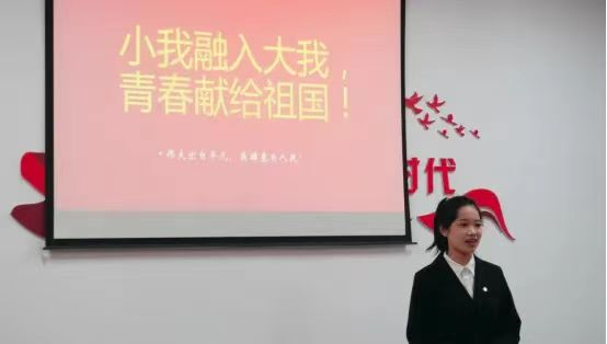 四月初学校启动“强国复兴有我”主题演讲比赛后,马冰焱同学以“小我融入大我,青春献给祖国”为题通过了学院初选和校级选拔,代表我校参加市级比赛。她的演讲声情并茂、字正腔圆,内容举例详实紧扣主题,配图与演讲衔接得宜。表现出当代大学生以“小我”向“大我”看齐,以青春奉献祖国建设的青春风貌。