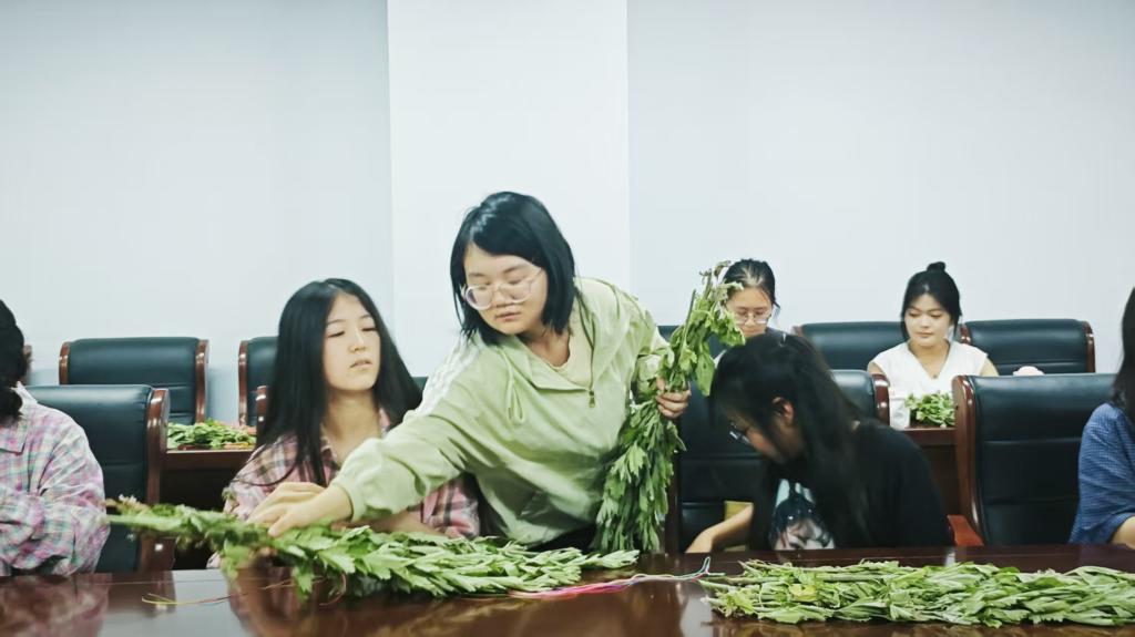 主持人以端午起源为切入点,阐述活动背景与意义。在“习俗分享”环节,来自不同地域的学生代表依次发言,生动讲述家乡端午传统。随后的“编五彩绳”和“制作艾叶挂件”手工体验环节将气氛推向高潮——主持人现场示范编织与制作技巧,工作人员分发材料,同学们积极尝试,创作出形式各异的五彩绳及艾叶挂件。体验结束后,师生围坐品尝不同风味的粽子,在粽香中体味端午节的文化内涵。