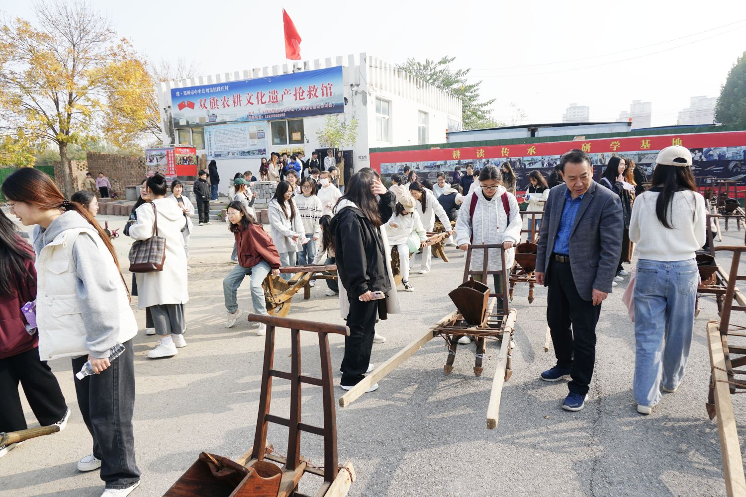 农耕馆馆长段双奇还在现场指导师生们体验了一系列传统农业器械:太平车的沉稳、独轮车的灵巧、耧车的精巧设计,每一件农具都蕴含着先人的智慧与汗水,师生们在亲身操作中,不仅感受到了传统农耕作业模式的艰辛与挑战,更深刻体会到了其中蕴含的深厚文化底蕴。