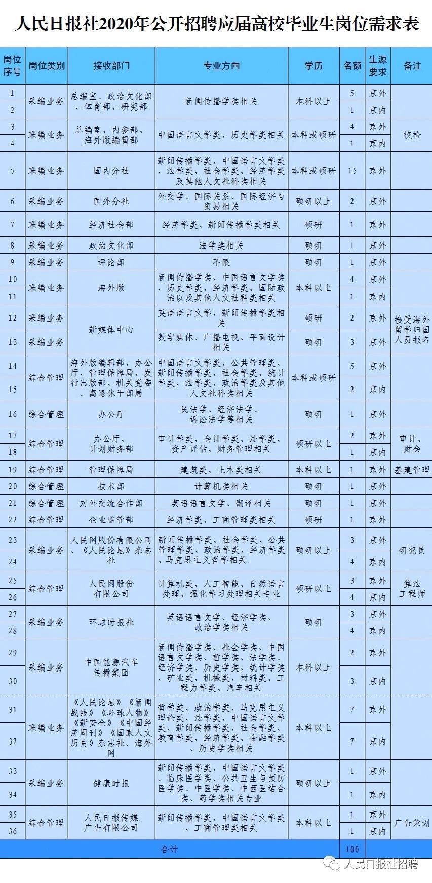 人民日报社根据事业发展需要,现面向2020届高校毕业生和海外留学归国人员公开招聘100名工作人员。现将有关事项公告如下: