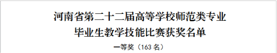 近日,河南省教育厅发布了《关于公布第二十二届高等学校师范类专业毕业生教学技能比赛结果的通知》(教办师〔2024〕378号),我院2021级汉语言文学专业学生王一帆在此次比赛中荣获初中语文组一等奖,为学院赢得了荣誉。