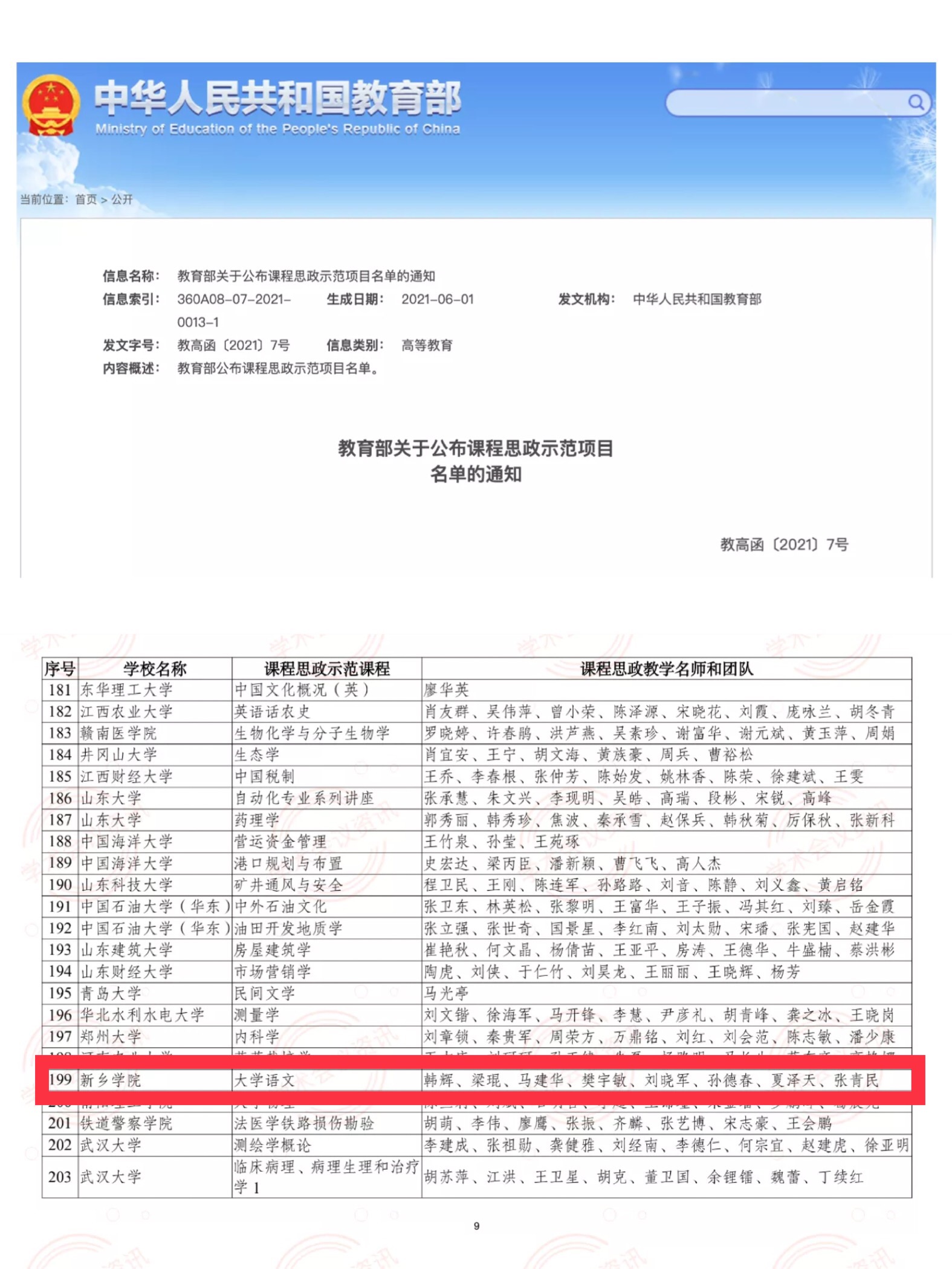 近日,教育部下发了《教育部关于公布课程思政示范项目名单的通知》(教高函〔2021〕7号),我院韩辉教授作为负责人申报的《大学语文》成功入选首批国家级课程思政示范课程,课程团队同时荣获国家级课程思政教学团队,实现了我校国家级课程和国家级教学团队零的突破!